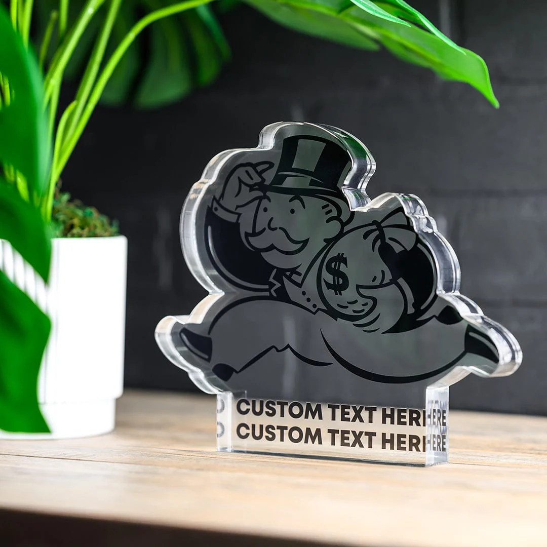 Add a personal touch to your space with the Custom Acrylic Monopoly Man Trophy, complete with customizable text for any achievement. Whether it's a big win or a milestone moment, this sleek piece lets you celebrate in style. Made from durable acrylic, it's the perfect way to showcase your success and level up your décor.