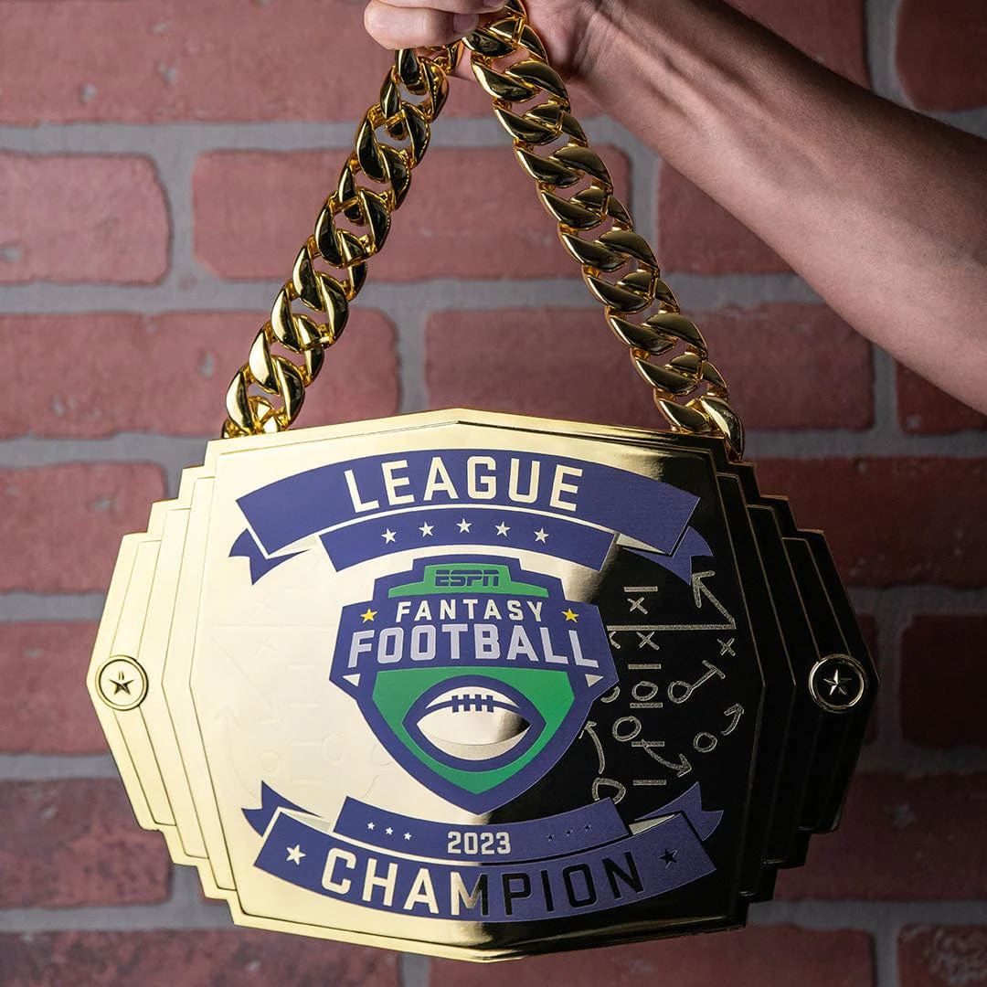 Show everyone that "the champ is here" with an ESPN Fantasy Football championship turnover chain from TrophySmack. Wear this bad boy around your neck, let it hang with pride, or hoist all 5 pounds of it victoriously over your head.