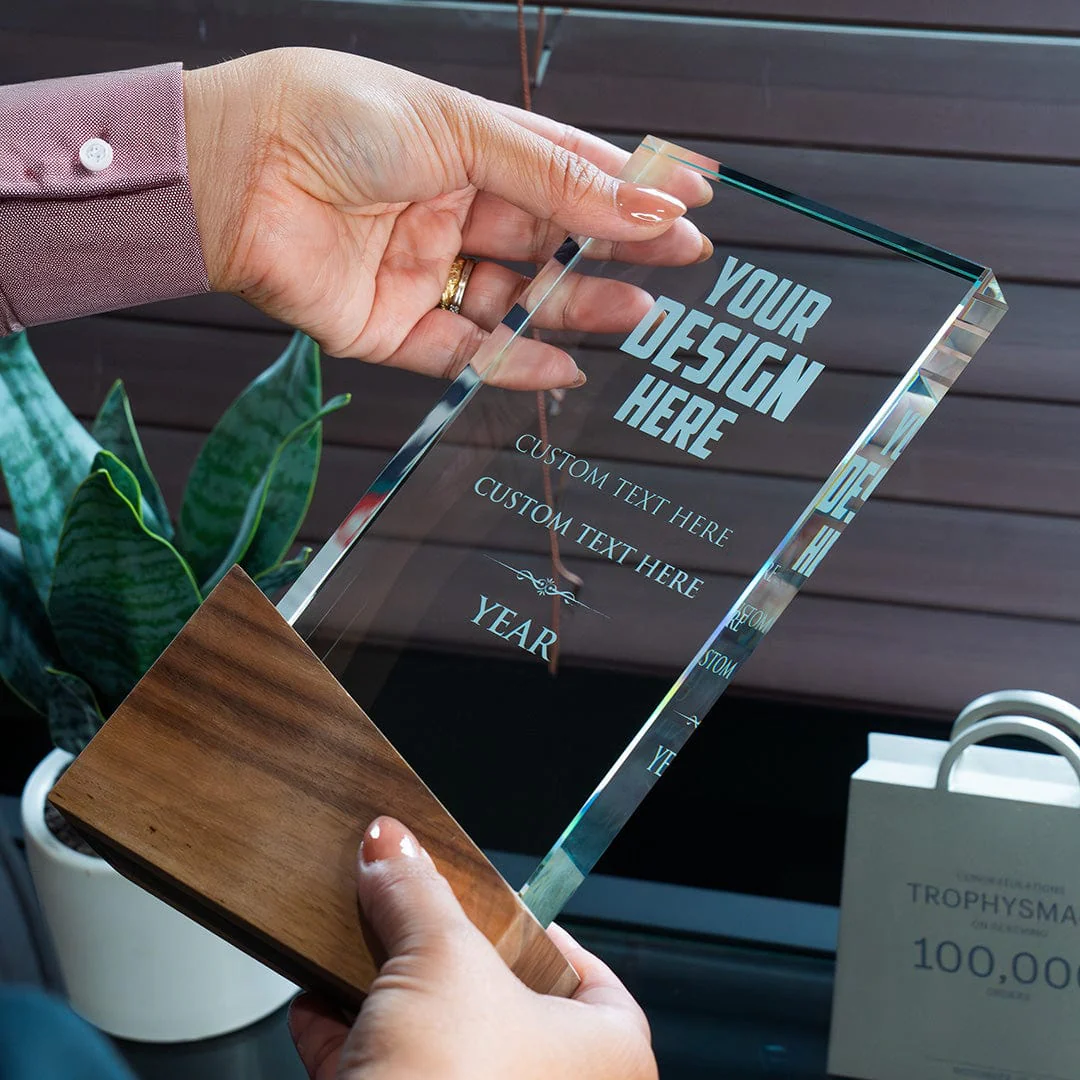 The 9.5"Â "Design Your Own" Custom Denali Crystal Awards a striking tribute to excellence, featuring a sleek, contemporary design. Customize it with your choice of text and logo to create a meaningful and memorable recognition piece. Perfect for honoring top performers or celebrating special achievements.