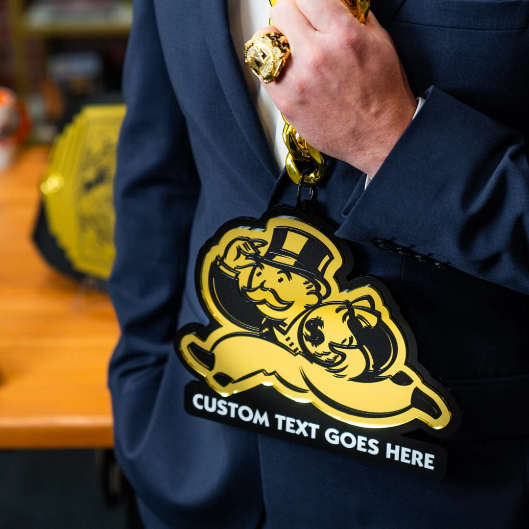 The Monopoly Running Man Chromatic Chain is for those who never stop chasing greatness. Featuring custom text, this chain lets you personalize your hustle and wear your drive with pride. With its dynamic design, it’s a bold reminder that success is earned through constant motion. Wear it and show the world you're always running toward your next big win.